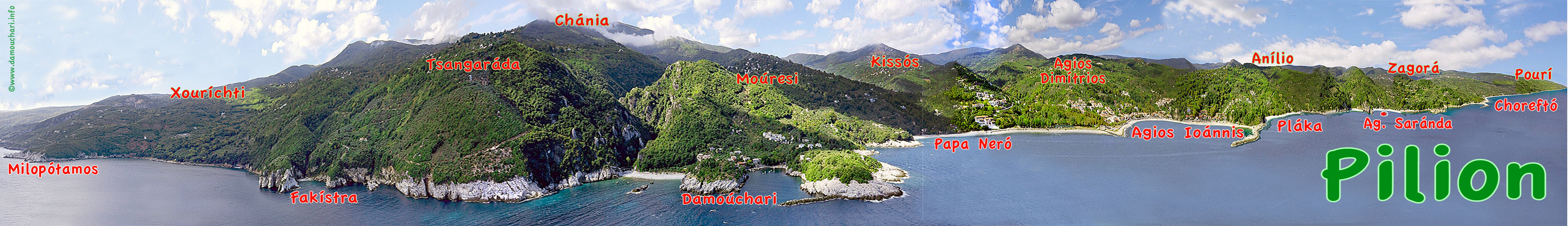 Der Pilion ist bis zu 1550 Meter hoch. Der Sage nach wohnten hier früher die Zentauren. Weil er so abgelegen ist, wurden die Wälder nie abgeholzt. Der Pilion ist extrem grün und wasserreich und hat im nördlichen Teil nur Laubbäume - Mittelmeereichen, die bis an das Wasser reichen, ab 600 Meter Kastanien und ab 900 Meter riesige Buchenwälder. Und an der Küste gibt es wunderbare Sand- und Kieselstrände.